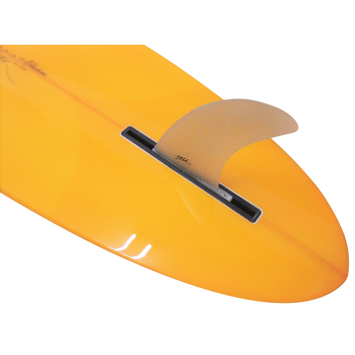 70`Sスタイルのレトロなアウトライン、ビークノーズ、レールはソフトなミディアムダウン、ボトムはシャローなVをベースにしたグラデーション、ややワイズを持たせたラウンドピンテールにそれぞれデザインされています。ロッカーはノーズ・テールともにロー、シングルボックス、フィンパッチ、オレンジ×イエローティントをベースにホワイト×ブラックのレジンピンライン、ポリッシュフィニッシュとなります。