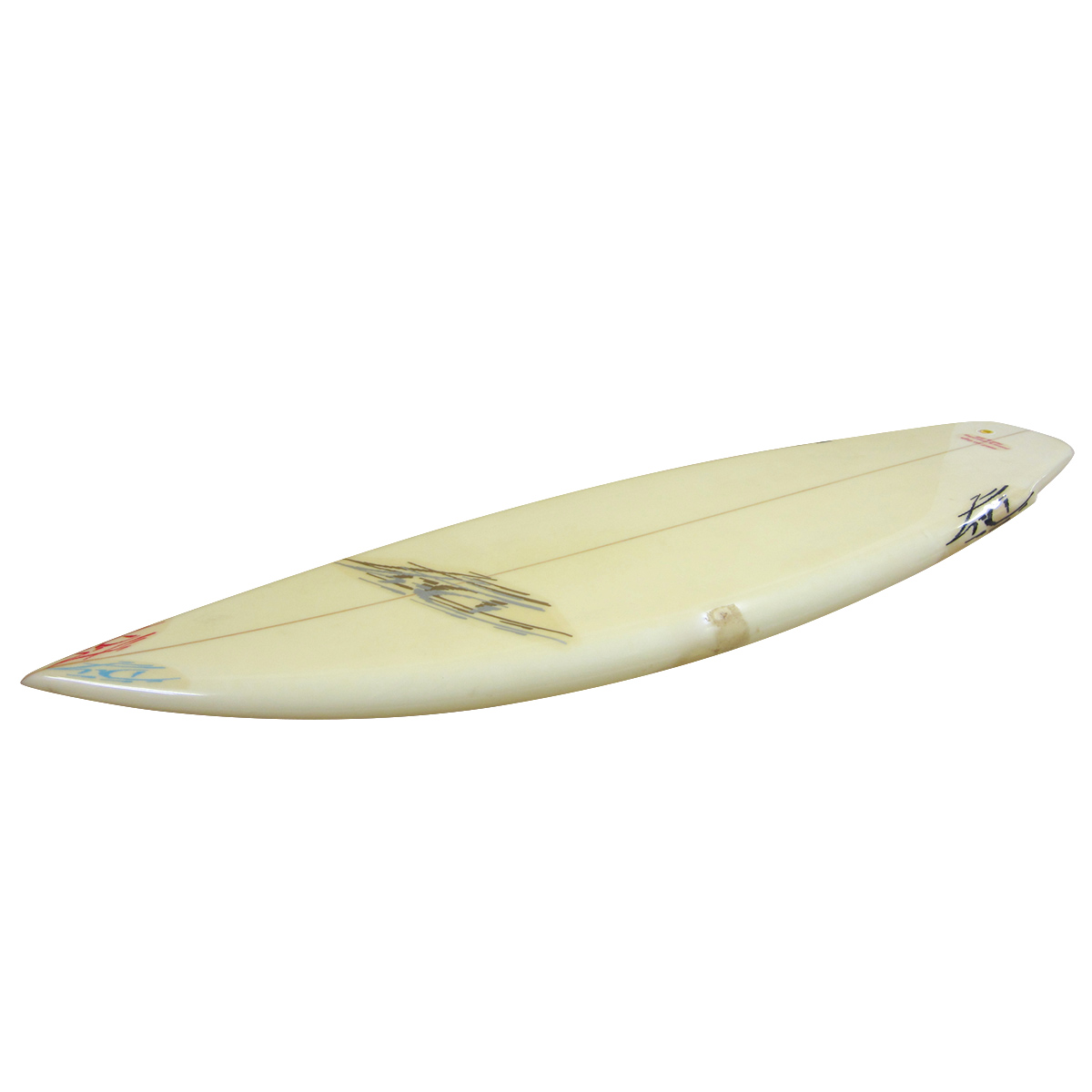 斬新なレトロモダンなボードデザイン、イーグルノーズ、非常に分厚くとられたレールはボキシーに、ボトムは浅いフラットV〜Vへのグラデーション、テールにかけてウイングが施され、テールはワイドなラウンドスクエアにそれぞれボードデザインされています。ロッカーはノーズはミドル、テールはローにセットされ、カラーはクリアで、クロスは6オンス仕様で、フィンセットはツインフィンのボックス仕様になります。