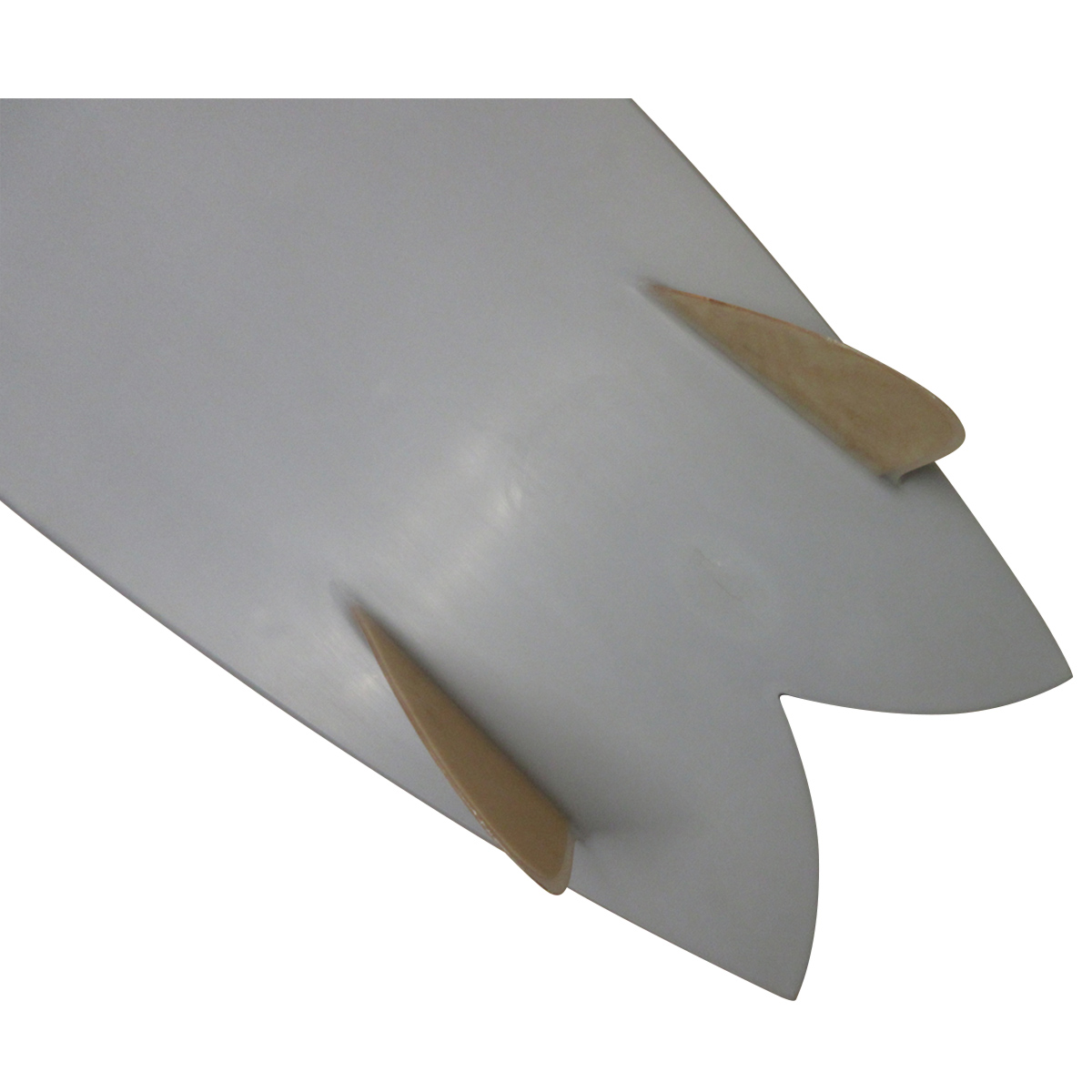 トラディッショナルなボードデザイン、ボリュームをしっかりと持たせたラウンドビークノーズ、レールはダウン調のフルボキシー、ボトム形状はV~フラット~シングルに、テールはフィッシュにそれぞれボードデザインされています。ロッカーはノーズ・テール共にゆるやかにセットされ、フィンはBirdsによるプライウッドのキールフィンがグラスオン、カラーはグレーオペークのウエットサンドで仕上げられています。