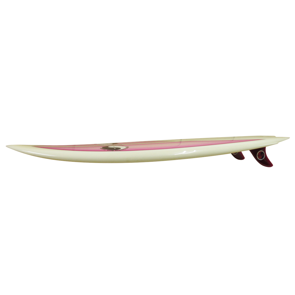 全体にボリュームを持たせたレトロなボードデザイン、イーグルノーズ、レールはフルダウンなミディアム、ボトムはラウンドV~Vのグラデーション、テールはシングルウィングでワイズを調整したスワローにそれぞれボードデザインされています。ロッカーはノーズがややミドル、テールがロー、フィンセットはグラスオンツイン、グラデーションがかったエアブラシ等、古きよき時代のエッセンスが盛りだくさんに取り入れられています。