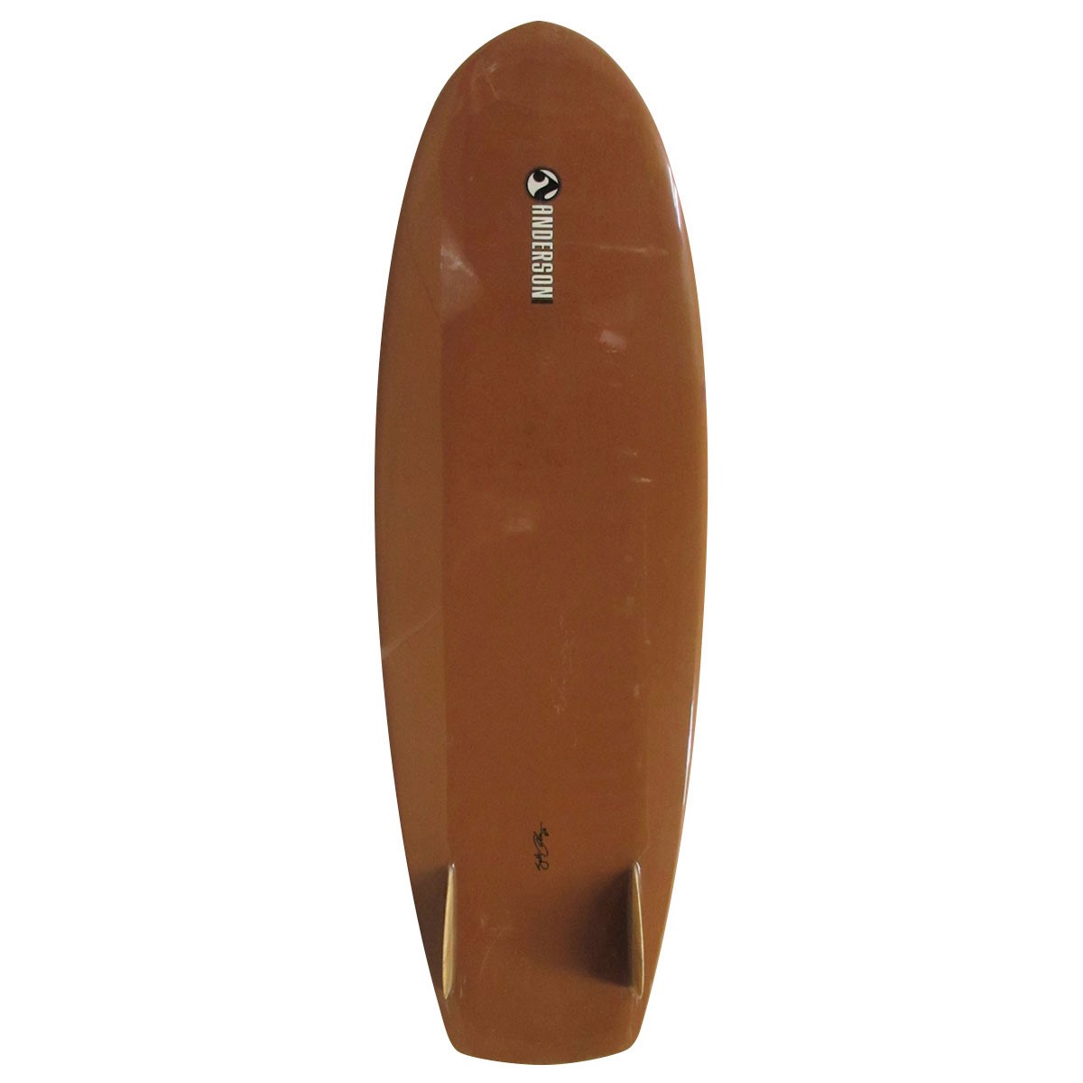 シモンズをベースとしボリュームを持たせたボードデザイン、ワイズを持たせたラウンドポイントノーズ、レールはミディアムテーパーに、ボトムはラウンド~トライプレーンシングルコンケイブ、テールはワイドなアークテールにそれぞれボードデザインされています。ロッカーはノーズはややミドルにテールはローにセットされ、フィンセットは101製のバンブーフィンがグラスオン、カラーはブラウンオペークのグロス&ポリッシュで仕上げられています。