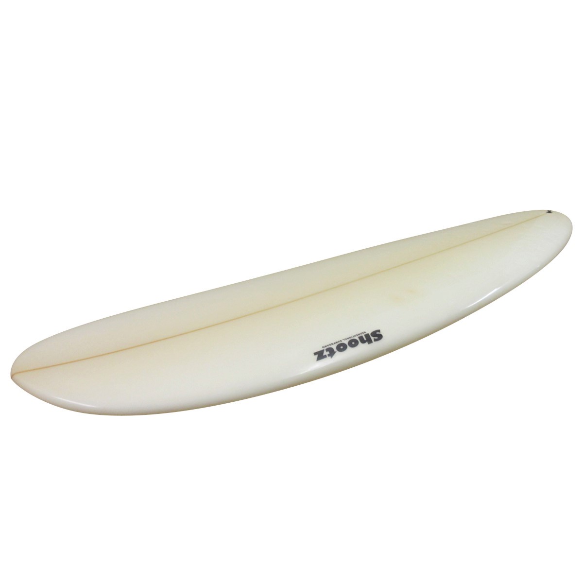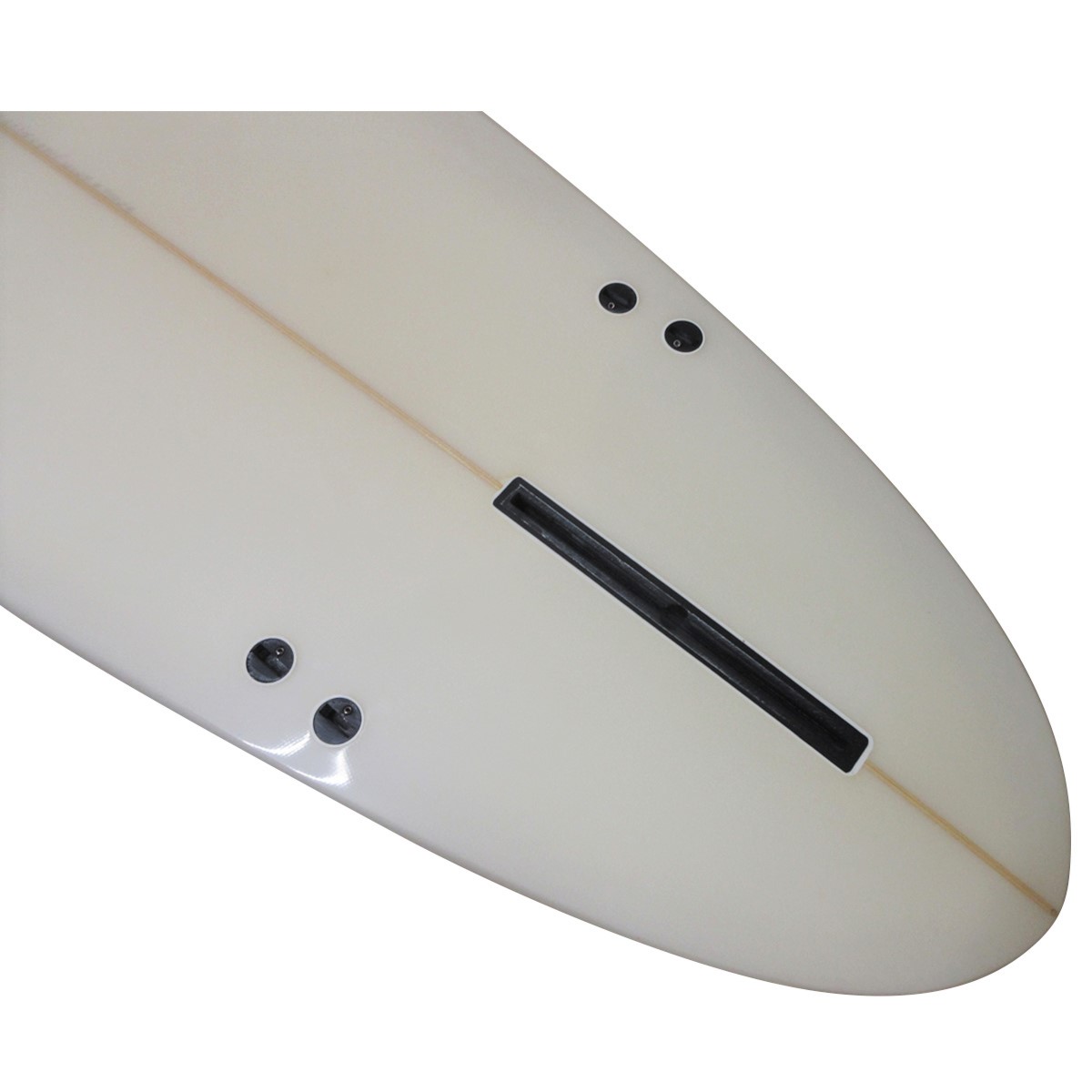 まさにファンなボードデザイン、ワイドなラウンドポイントノーズ、レールはハイボリュームなミディアムボキシー、ボトムはダブル~VEE、テールはワイドなラウンドピンそれぞれボードデザインされています。ロッカーはノーズ・テールともに緩やかにセットされ、フィンセットはFCSプラグのシングルスタビ仕様、PUフォームを使用しクリアーのグロス&ポリッシュで仕上げられています。