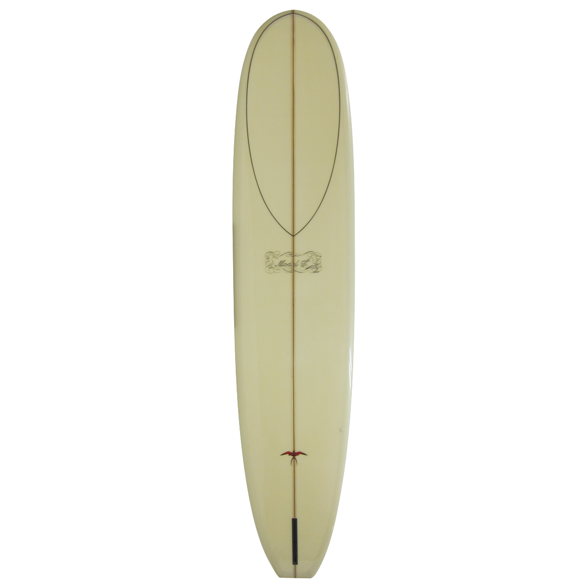 王道なクラシカルなボードデザイン、独自のワイドなラウンドポイントノーズ、レールはボキシーに、ボトムはノーズコンケイブ~ラウンドVボトム、テールはスクエアにそれぞれボードデザインされています。フィンセットはシングルフィン仕様で、ロッカーはノーズ・テールともにローにセットされ、ブランクスには希少なブラックのカラーフォームをレッドウッドでTバンドしたウォーカーフォームが使用され、クロスはボランクロス仕様でカラーはクリアで、ニーパッチとフィンパッチがそれぞれ施され、ロゴにはコアなタカヤマファンには涙ものなModel-Tのミニロゴが使用されています。