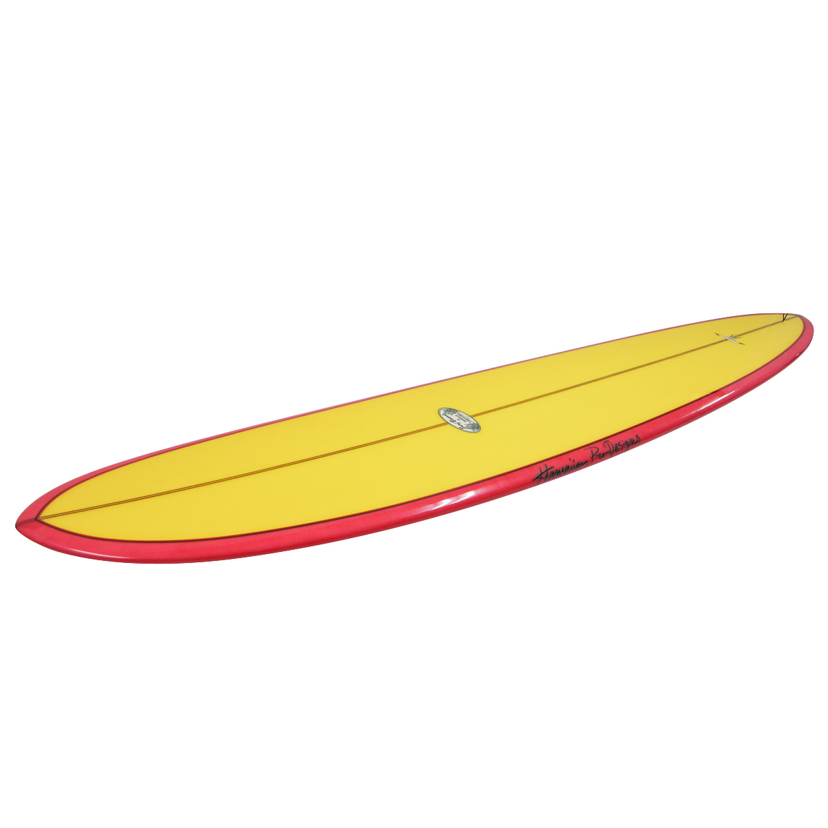 オールラウンドを基調とした洗練されたボードデザイン、コンパクトなラウンドポイントノーズ、レールはソフトボキシーに、ボトムにはノーズコンケイブ~ラウンド~Vボトム、テールはラウンドピンにそれぞれボードデザインされています。ロッカーはノーズ・テールともにミドル〜ローにセットされ、フィンセットはシングルスタビ仕様で、ブランクスにはサンドイッチストリンガーのものが使用され、カラーはデッキはイエローティントをベースにブラック×レッドのピンライン、レールからボトムはレッドティントでスタイリッシュに仕上げられています。