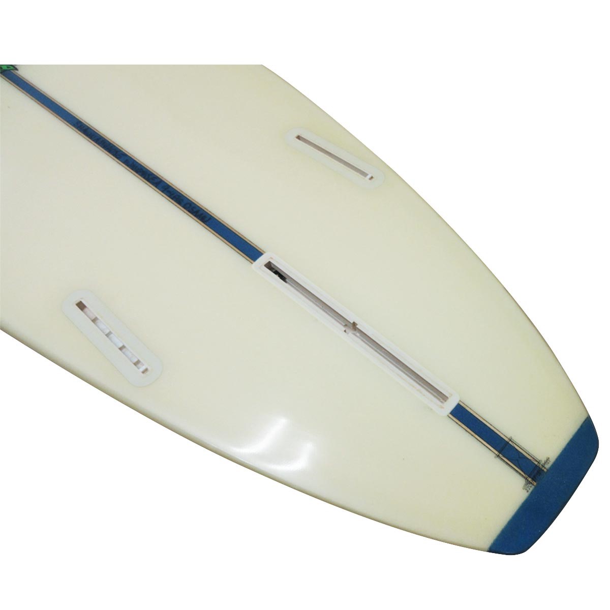 モダンクラシカルなアウトライン、ノーズは独特のステップデッキを施したラウンドポイントノーズに、レールはミディアムボキシーに、ボトムはラウンド~ラウンドVee、ノーズエリア両側に独自のスロットルコンケーブが入っており、テールはエッジの入ったラウンドスクエアに、それぞれボードデザインされています。フィンシステムはO'FISH'Lサイドフィンプラグのシングルスタビ仕様、ロッカーはノーズはミドルに、テールはローにセットされ、ストリンガーはブルーのカラーフォームTバンド、テールエンドもブルーのカラーフォームが施されたスペシャルブランクスを採用、ステップデッキ部分にはピンラインが施され、クリアーのグロス&ポリッシュ仕上げとなっています。
