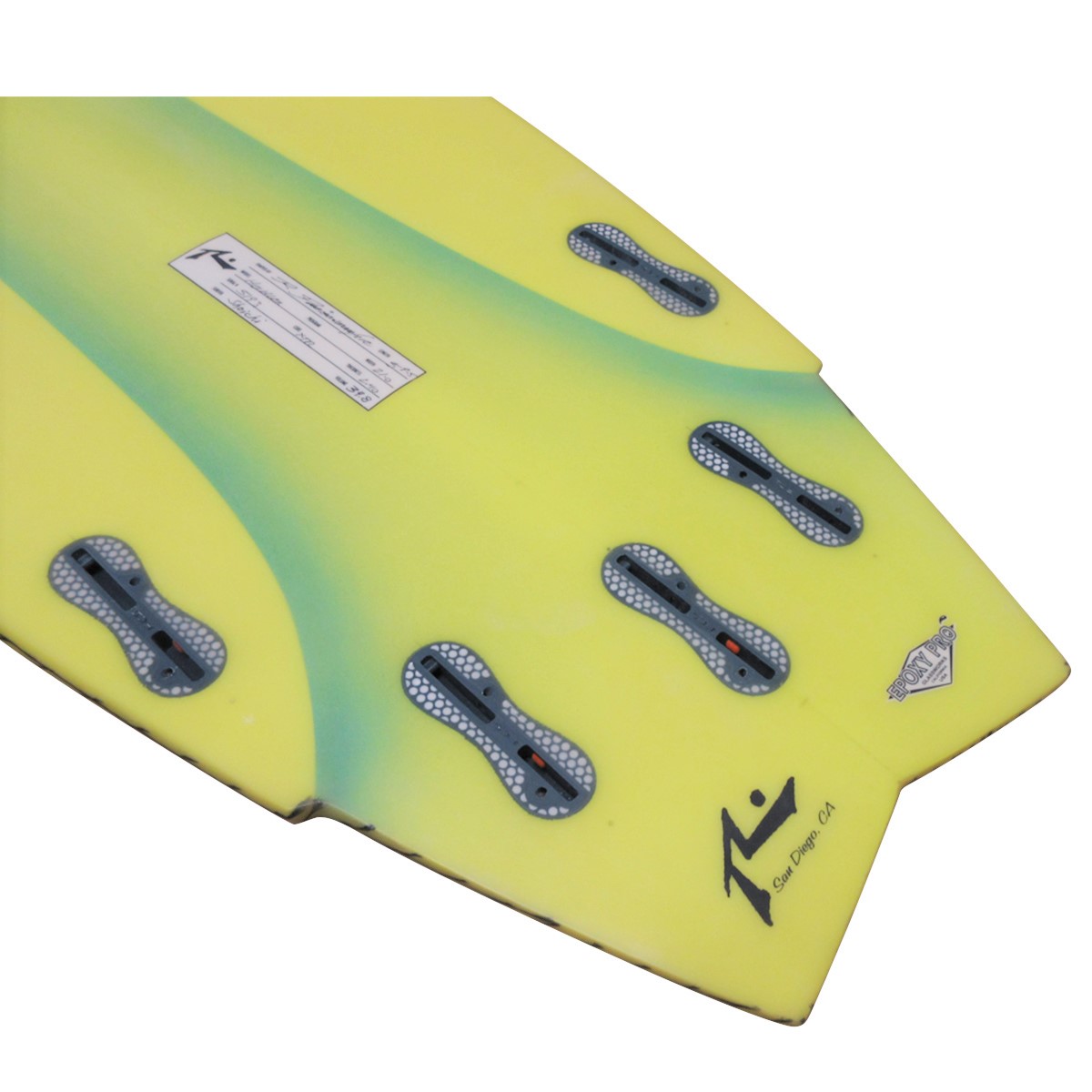 全体的にボリュームをもたせたハイブリッドなボードデザイン、イーグルノーズ、レールは程よくボリュームを残したミディアムに、ボトムはフラットエントリー~Venturi(ベンチューリ)ボトムと呼ばれるRUSTYオリジナルのチャンネルボトムのグラデーション、テールはシングルウイングが入ったワイドスワローテールにそれぞれボードデザインされています。ロッカーはノーズ・テール共にミドルにセットされ、フィンはFCS2プラグの5フィン仕様で、カラーはイエロー+チャンネル部にブルーのエアブラシ、スタンディング部分にカーボンが施されたストリンガーレスのXTR構造となります。