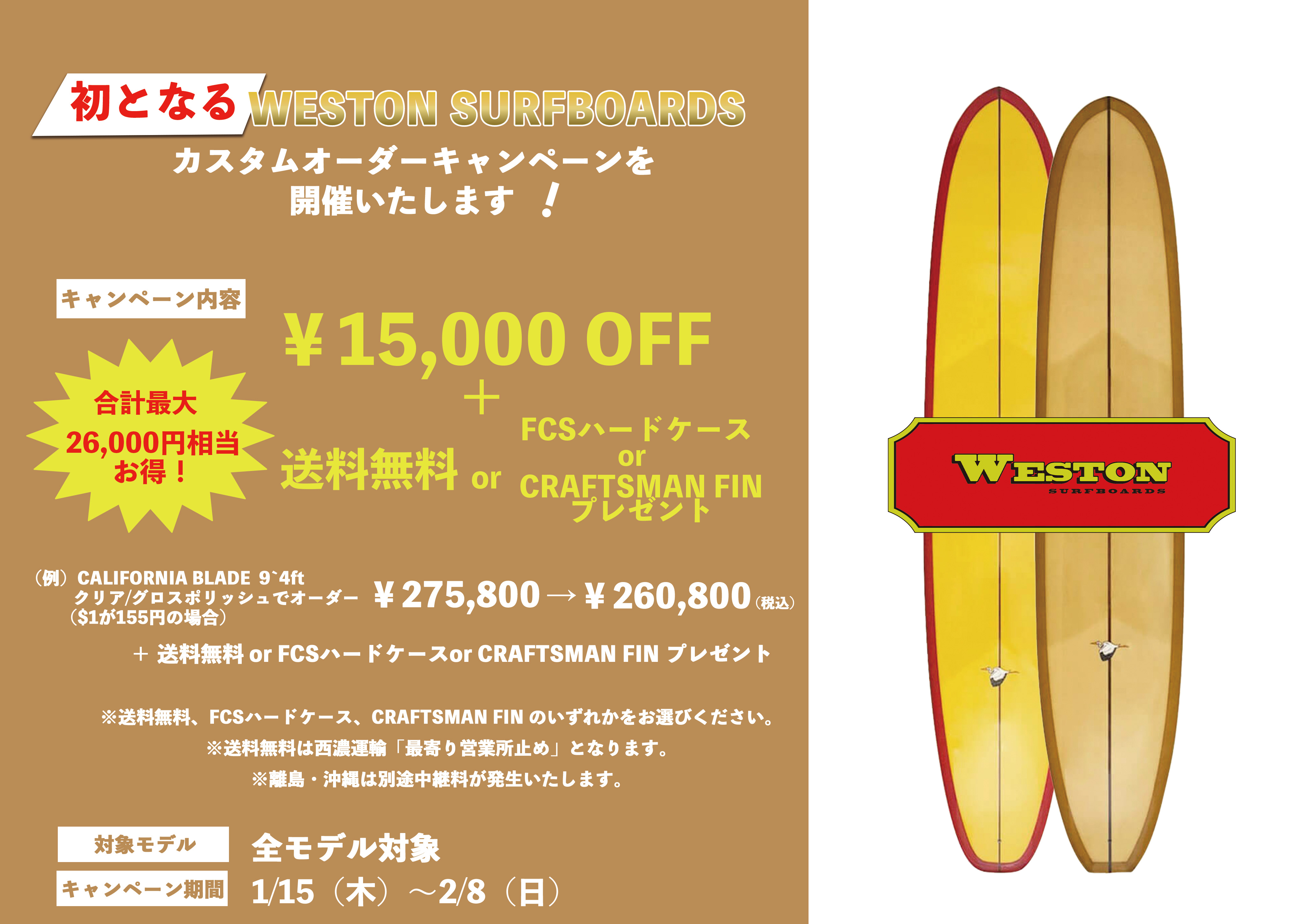湘南店初となる「WESTON SURFBOARDS カスタムオーダーキャンペーン」を開催いたします。合計最大26,000円相当お得にオーダーできるチャンス!