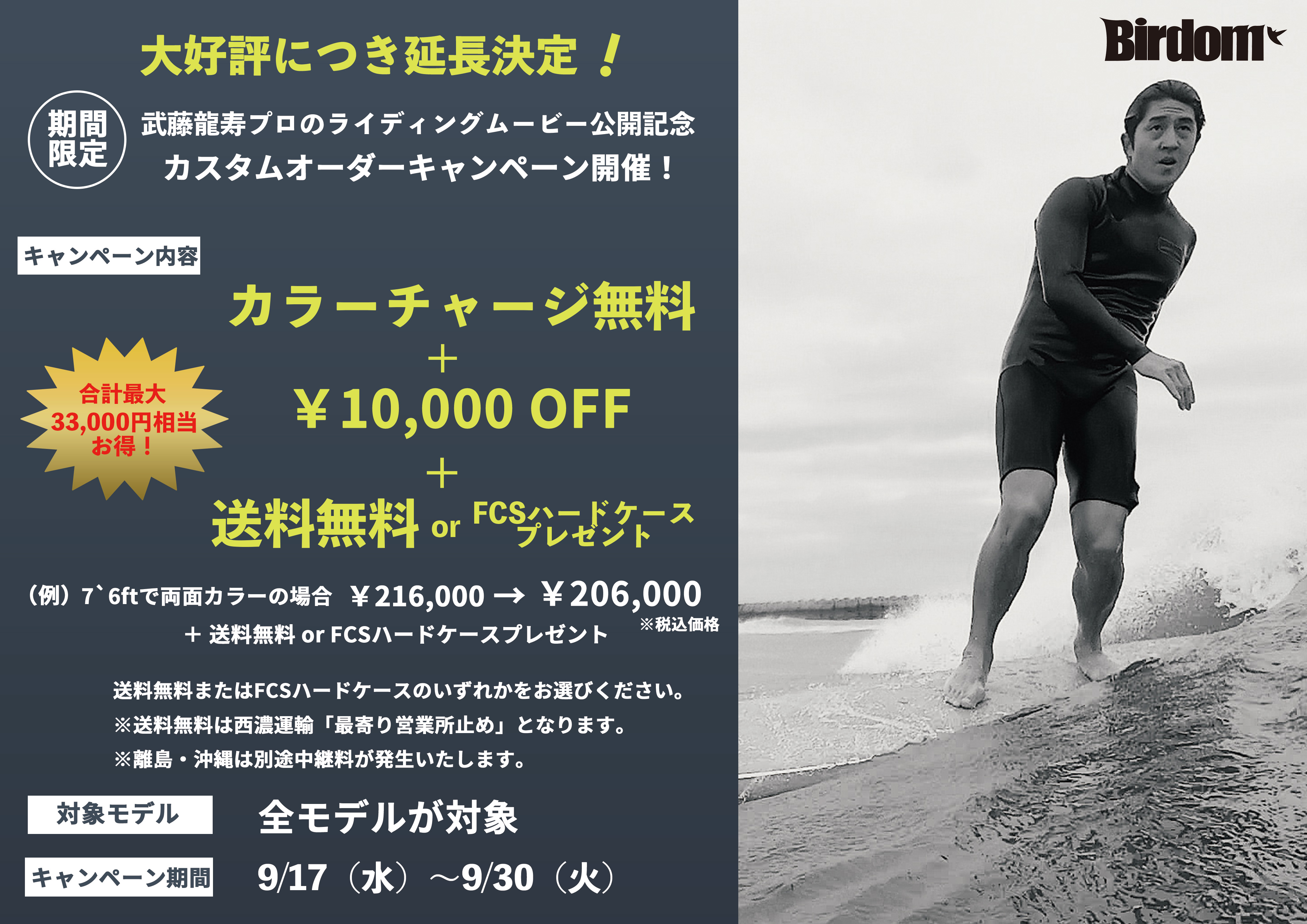 湘南店武藤龍寿プロのライディングムービー公開記念 !期間限定のBIRDOMカスタムオーダーキャンペーン開催!最大33,000円相当お得!